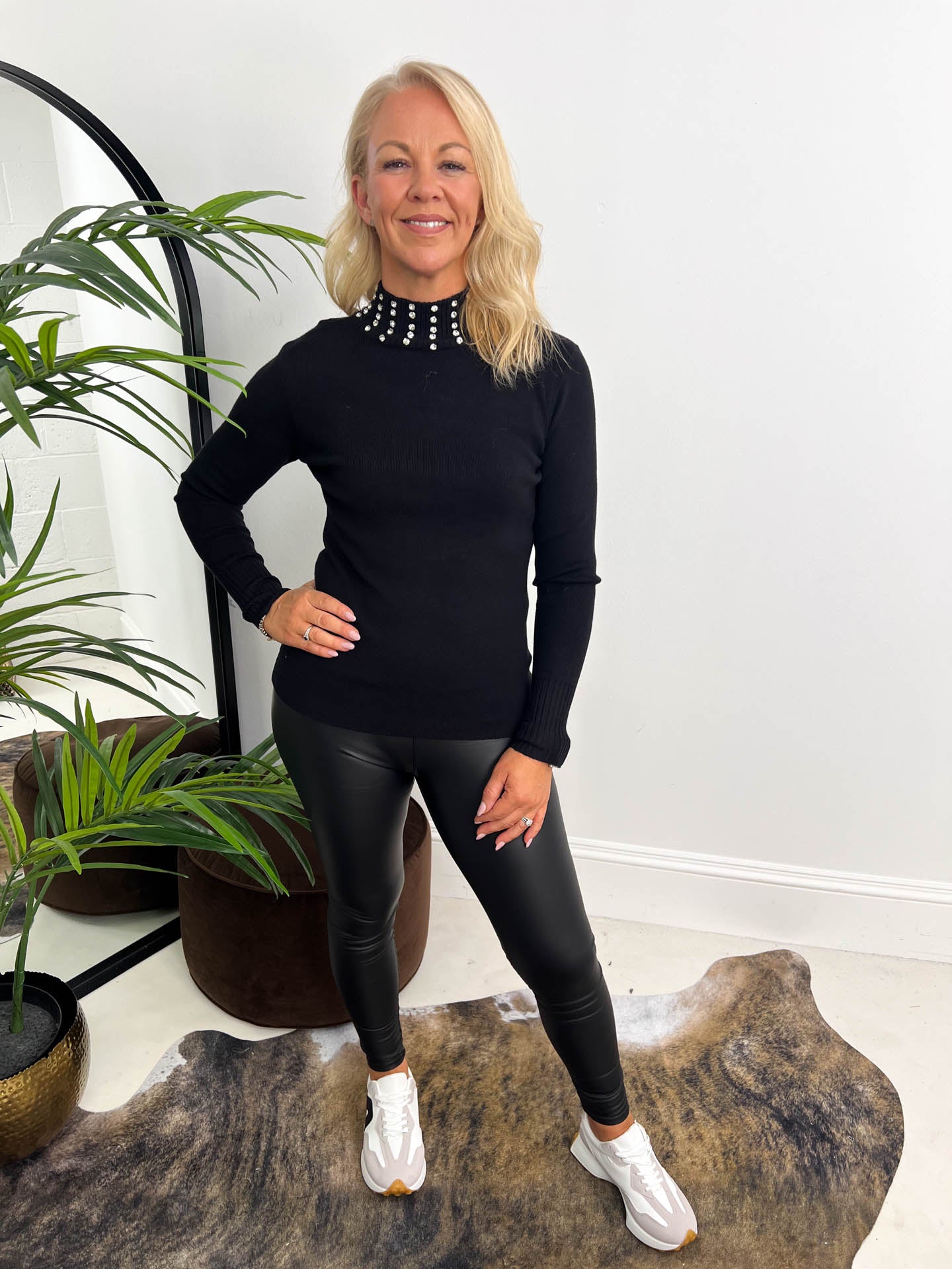 OMG how cute is our Tia Knit Top?! Perfect for glamming you your everyday outfits, this features a soft knit material, a long sleeve design, and a high neck with diamanté embellishment. We've paired this with faux leather trousers and trainers for the perfect girls day 'fit.