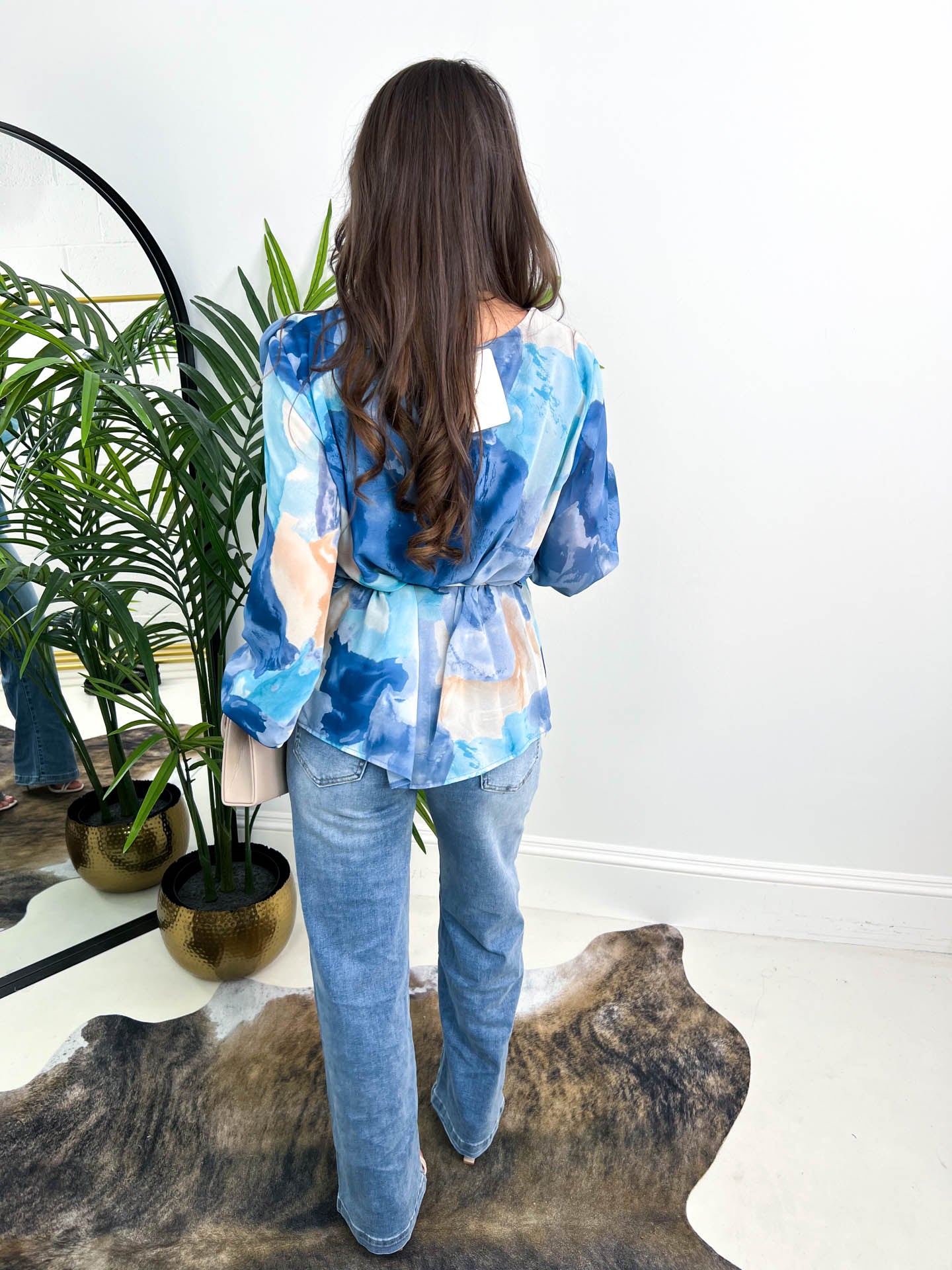 The Trisha is a floaty style blouse with round neck, and tie waist that created shape to the blouse. This comes in a beautiful, marble effect print with different colours throughout. If you are looking for easy tops to pair with jeans then the Trisha is the perfect pick.