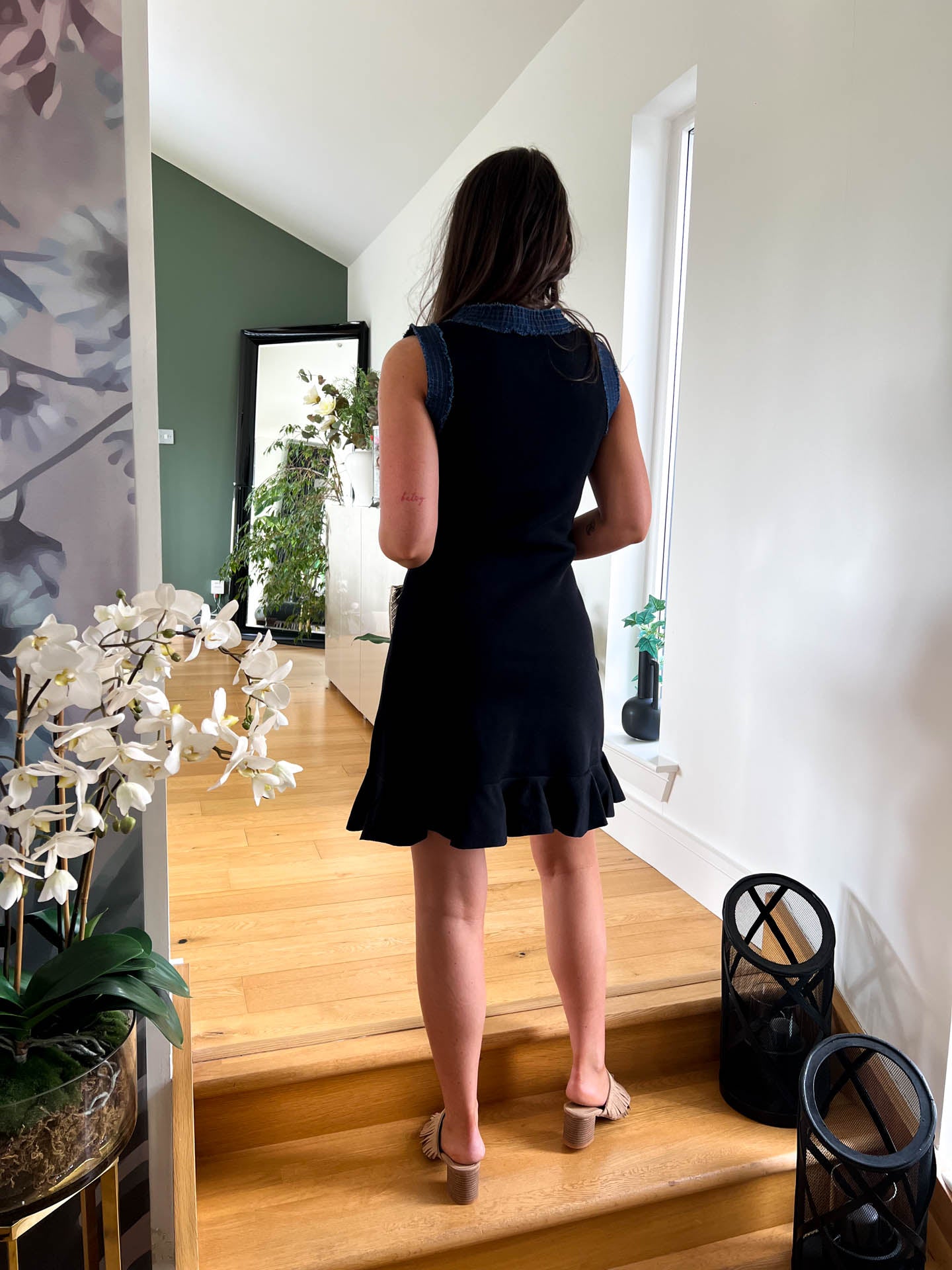 The Yasmin is a striking black mini dress that combines classic elegance with contemporary edge. Featuring distinctive denim detailing along the armholes, collar, and front placket, this piece offers a bold contrast that elevates the silhouette. The playful frill at the hem adds movement and dimension, creating a flattering finish. Perfect for those seeking a versatile dress that transitions effortlessly from day to night, The Yasmin delivers both style and personality in one statement piece.