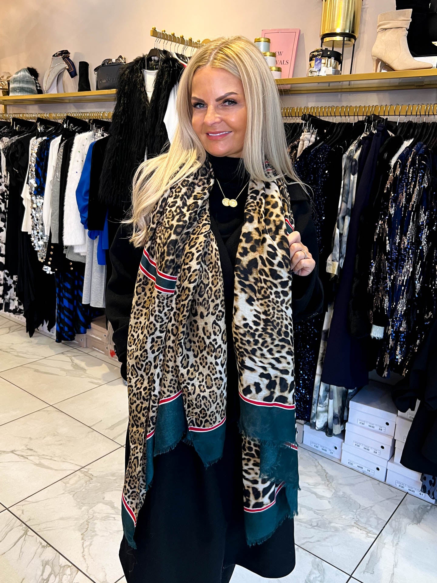 Our gorgeous Zara scarf features stunning leopard print and red stripes. This scarf is available in Green, Orange and Black.